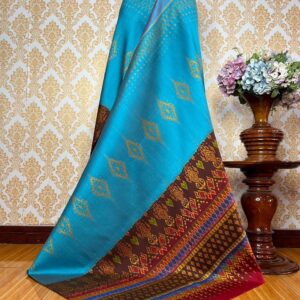 ซิ่น ผ้าไหมมัดหมี่ 3ตะกอ ขนาด 1×2เมตร พื้นสีฟ้า รหัส R2Q-KN-06116721114