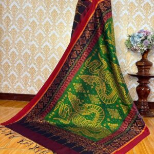 ซิ่น ผ้าไหมมัดหมี่ ทอยกดอก 6ตะกอ ขนาด 1×2เมตร ลายเชิงช้าง พื้นสีเขียว รหัส L9A-KN-0507672213